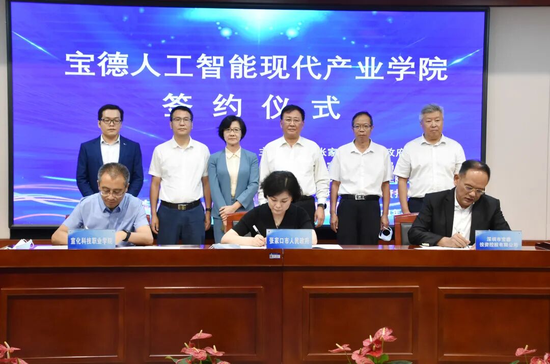 儀式上,張家口市副市長閆利艷、宣化科技職業學院黨委書記馮文利、深圳市寶德投資控股有限公司董事長李瑞杰分別代表三方簽署了校企合作協議。馮文利書記與李瑞杰董事長,共同為“寶德人工智能現代產業學院”揭牌。