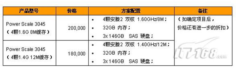 以Power Scale 3045 產品為例,選擇4顆安滕 2雙核 1.6G (8M緩存)和1.4G (12M緩存)的兩種處理器,按內核和內存1:2的比例,選擇32G DDR2 533M 的內存,以及4塊146G SAS 3.5’ 硬盤,做Raid 5,這樣的一個配置要求,給出以下的一個價格,但這只是配置的價格,具體的折扣需要進一步深入洽談