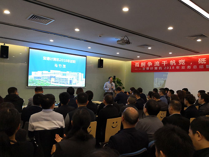 上午9時整,會議準時召開。會議首先由寶德計算機業務總經理馬竹茂作“寶德服務器業務2018年Q4業務總結和2019年業務規劃報告”,馬總用數據化的語言對公司2018年訂單銷售、重點工作以及回款情況進行了詳實的總結和回顧,同時對工作中存在的問題進行了全面分析,并制定了2019年工作計劃與目標。馬總指出,2018年是極具挑戰的一年,逆境促人成長,各地區互幫互助,不忘初心、砥礪奮進。新的一年里要繼續努力,嚴格遵守公司政策制度,構建強有力的團隊,提高銷售隊伍的綜合實力,搶占先機,贏得市場。