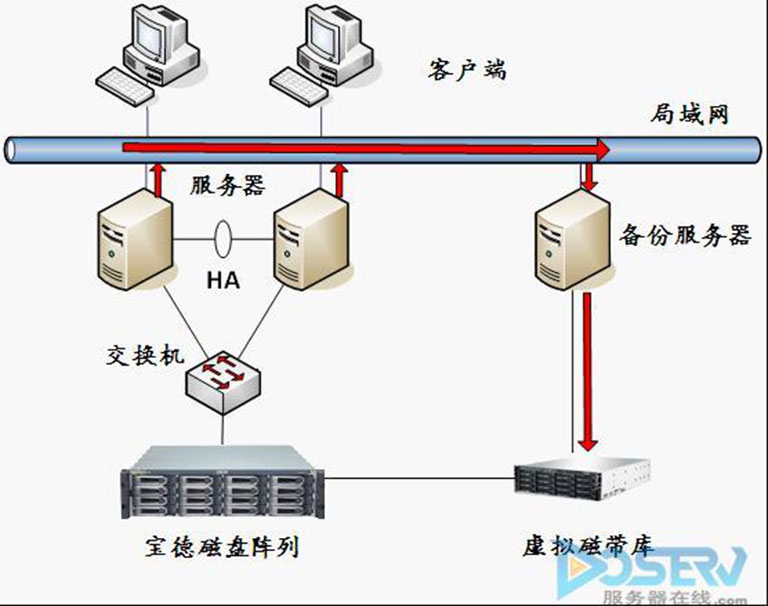 本方案推薦的寶德備份系統(tǒng)可靈活采用LAN與LAN-Free相結合的架構,充分利用用戶現(xiàn)有基礎網(wǎng)絡架構,對關鍵數(shù)據(jù)進行完善的備份保護。備份設備采用寶德VTL虛擬磁帶庫,充分吸收了磁帶介質(zhì)和磁盤介質(zhì)二種備份介質(zhì)的優(yōu)點,在備份性能、可靠性、易于管理,提供多種靈活可選的虛擬方式,通過備份服務器上安裝的軟件實現(xiàn)基于制定策略的自動備份,以保證在需要的時候進行快速無誤的恢復,為用戶的信息系統(tǒng)保駕護航。