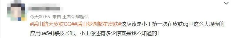 上述對話出自王者榮耀攜手新華社與中國航天ASES 聯合出品的盾山航天皮膚CG,該CG一出更是一度沖上了微博熱搜。微博用戶紛紛表示,CG質量真是太好了,更是從中深深地感受到了航天人的不斷向前、探索以及不怕犧牲的精神。也有用戶表示,此次CG制作,引用了大量的UE5引擎進行渲染,呈現出了大片質感,給人意想不到的效果。