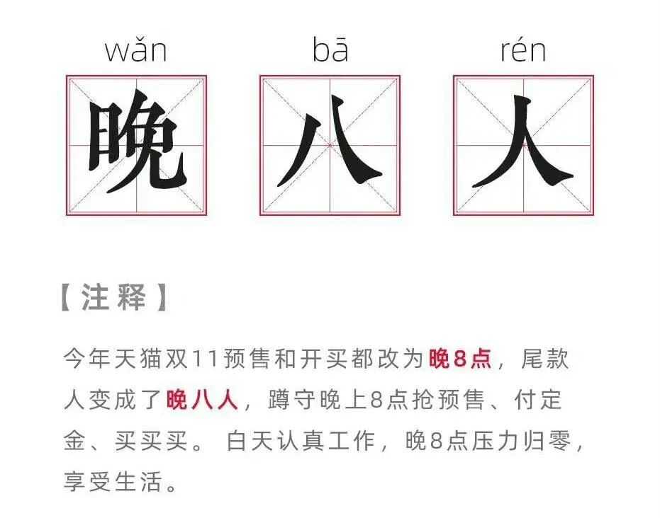 不同于以往的雙十一,今年預售時間縮短,新增了購物車擴容和一鍵退差價等新功能,且無論是“預售付定金”階段還是“付尾款”階段,都告別了零點,改從晚上8點開始,消費者可以提前蹲點預定搶購,從而也衍生出了“晚八人”這一網絡新詞。